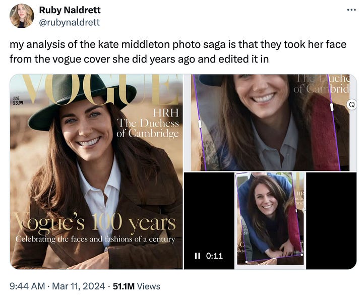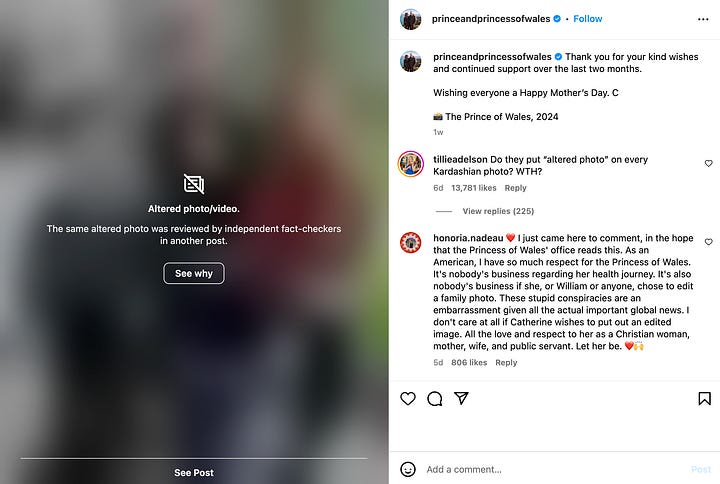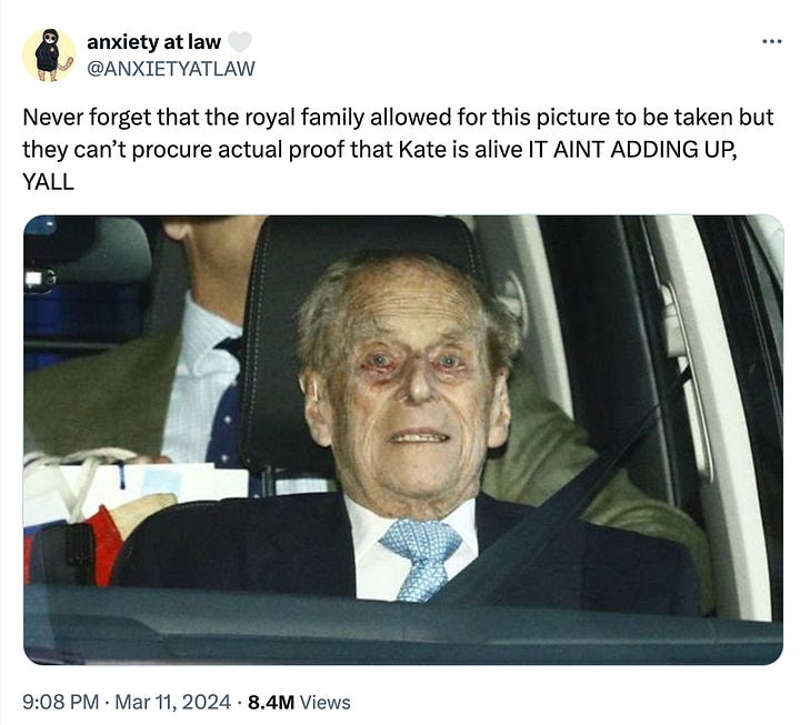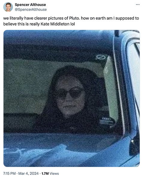 Public figures—celebrities, influencers, elected officials, and working royals—are people, too.8 Cases have been and will continue in perpetuity to be made to allow even the most visible people to have their privacy. But those arguments lose some of their weight when public interest shifts to public concern, and that is what appears to have happened regarding Middleton. The discourse quickly moved away from jokes about her recovering from a BBL to trying to figure out what unsavory or unsafe truth the Institution isn’t sharing—because why else would they break all their rules and botch a PR situation so badly if this situation wasn’t unprecedented?9