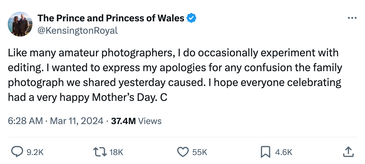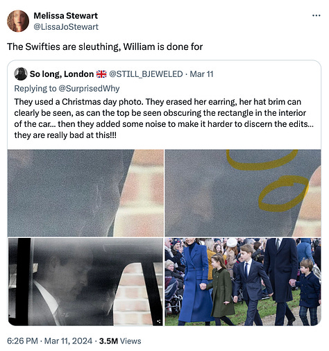 For those not tracking the discourse online, this was the moment when the tone started to shift. Several individuals began to investigate the validity of all photos alleging to be of Kate Middleton since her last known appearance in December 2023; while there was still an air of conspiracy theory to everything, this was when it started to feel like perhaps the global public was truly being lied to.