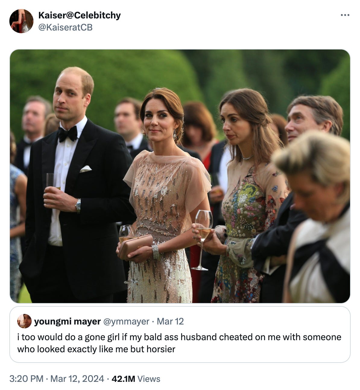 Which is, at least to the Internet, the leading reason for the Palace to lie about where Middleton truly is. On March 10th—the day of what some people are pushing to dub “Kategate” with the same enthusiasm as Gretchen Wieners trying to make fetch happen—The Independent released an article titled, “Lady Rose Hanbury: Who is the Marchioness of Cholmondeley?” The story almost immediately started going viral as it piqued interest in a long hinted-at rumor that Prince William was having an affair with Princess Kate’s best friend and may have even fathered her two sons.6