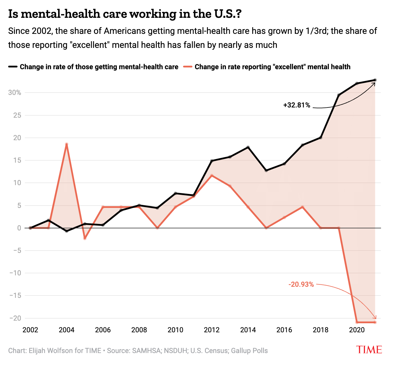 She goes on to write about how many experts believe that these stats are getting worse despite the destigmatization of mental healthcare because the original framework for modern psychiatry was not designed to provide us with the support we need now. Ducharme shares commentary from
