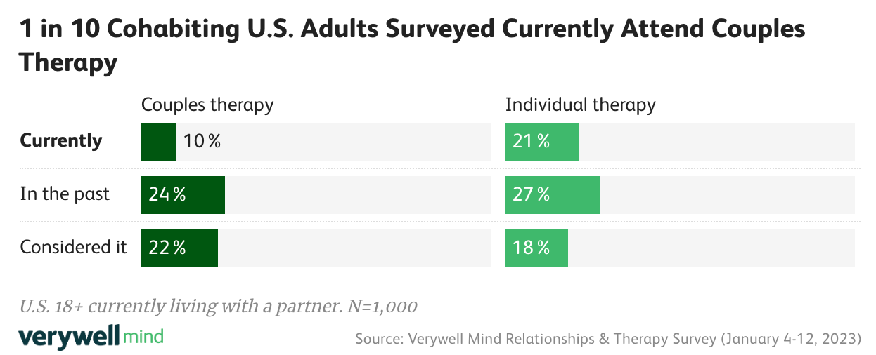 It’s harder than you think to find the exact numbers on how many couples in the United States seek out joint counseling but the most up-to-date information I’ve been able to find comes from online therapy provider, Well Marriage Center. As of this year, they reported that “nearly 49% of married couples report attending counseling together at some point in their relationship,” which makes sense when you also track changing opinions around couples therapy.